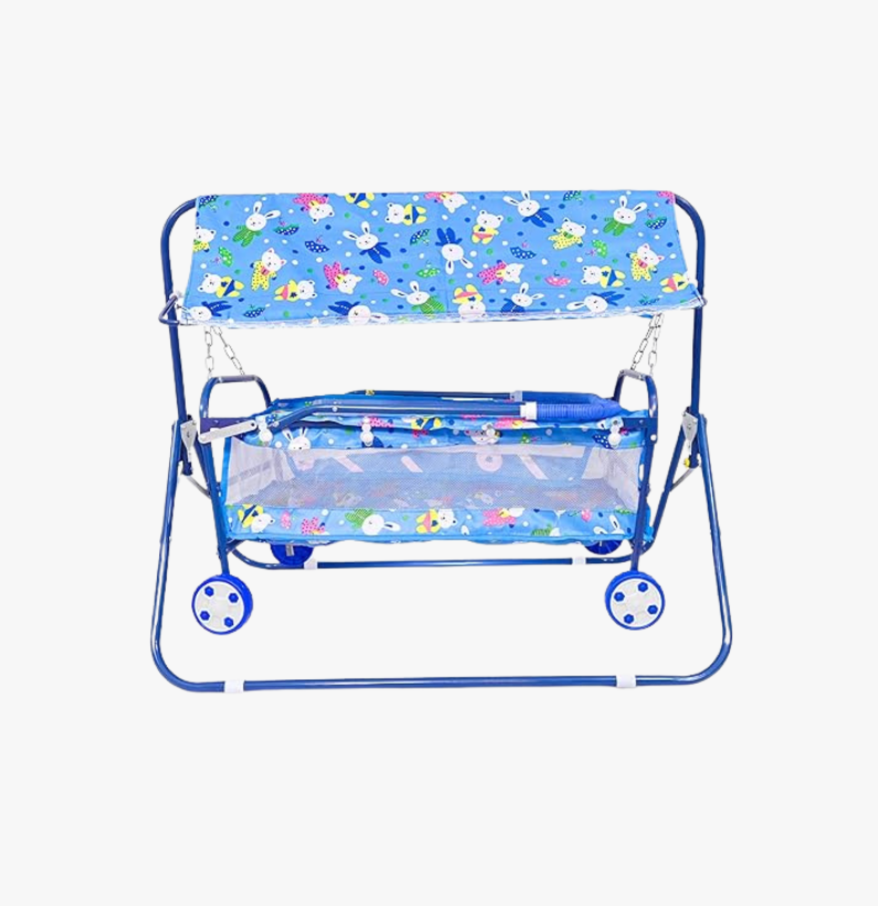This four-wheel baby cradle is ideal for newborns up to 13 months, offering comfort, safety, and easy mobility around the home. Designed with a sturdy metal frame and breathable mesh fabric, it provides a secure and well-ventilated resting space for baby boys and girls. The charming pattern of bunnies, flowers, and colorful dots creates a cheerful and soothing environment, while the adjustable canopy adds extra comfort. Foldable and versatile, it can be used as a baby palna, cradle, swing, jhula, bassinet, cot, or crib.